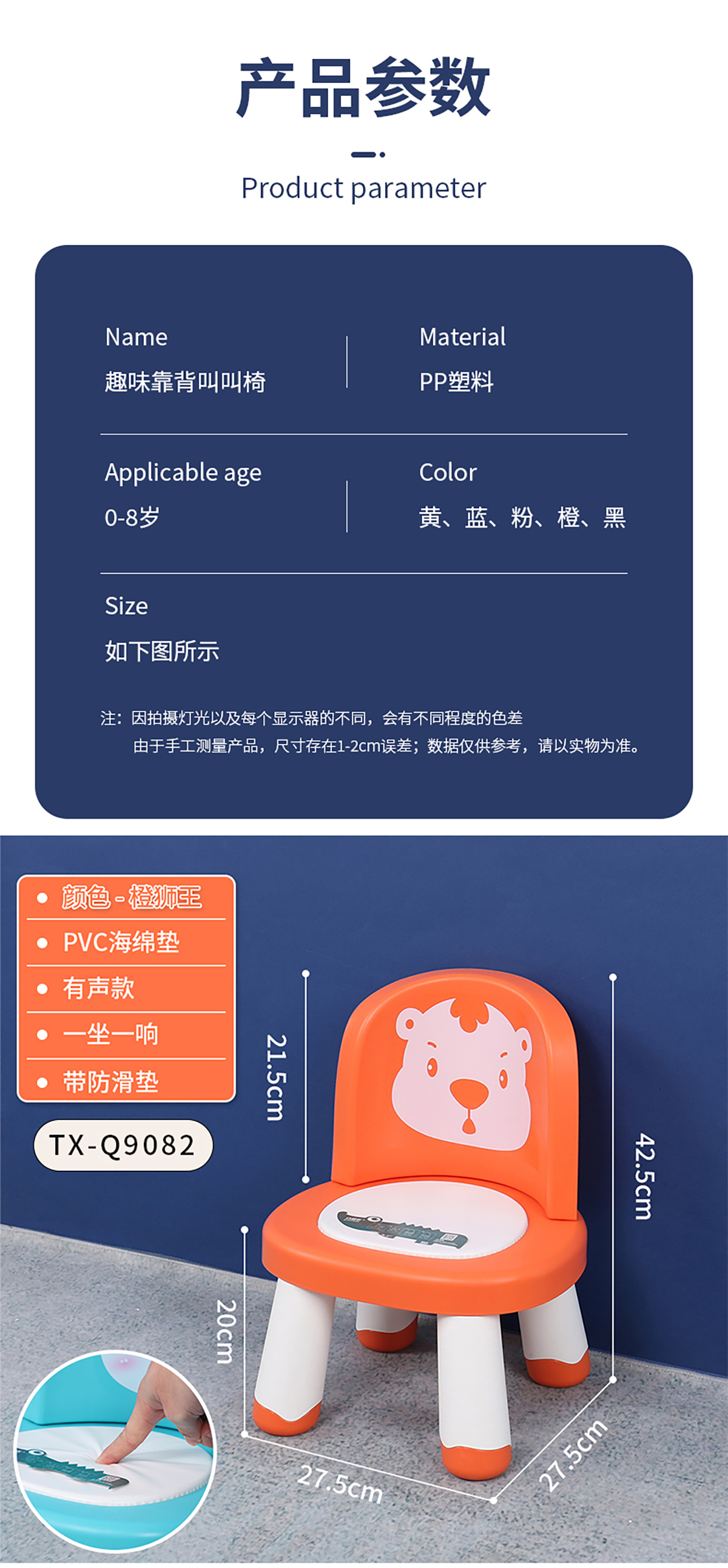 Size: TX-Q9082(有聲):長(zhǎng)320*寬290*高420椅面高200mm TX-Q9084(無聲):長(zhǎng)320*寬290*高420椅面高200mm