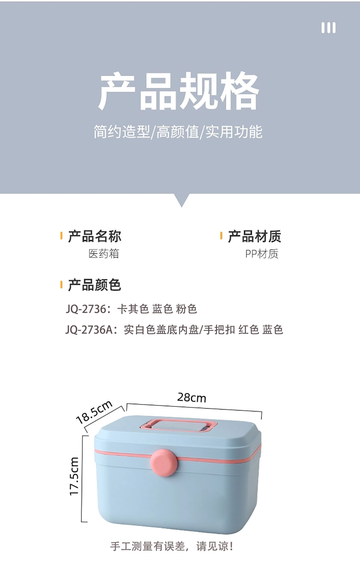 Remarks:JQ-2736:卡其色 粉色 藍色 JQ-2736A:實白色蓋底內(nèi)盤/手把扣 紅色 藍色